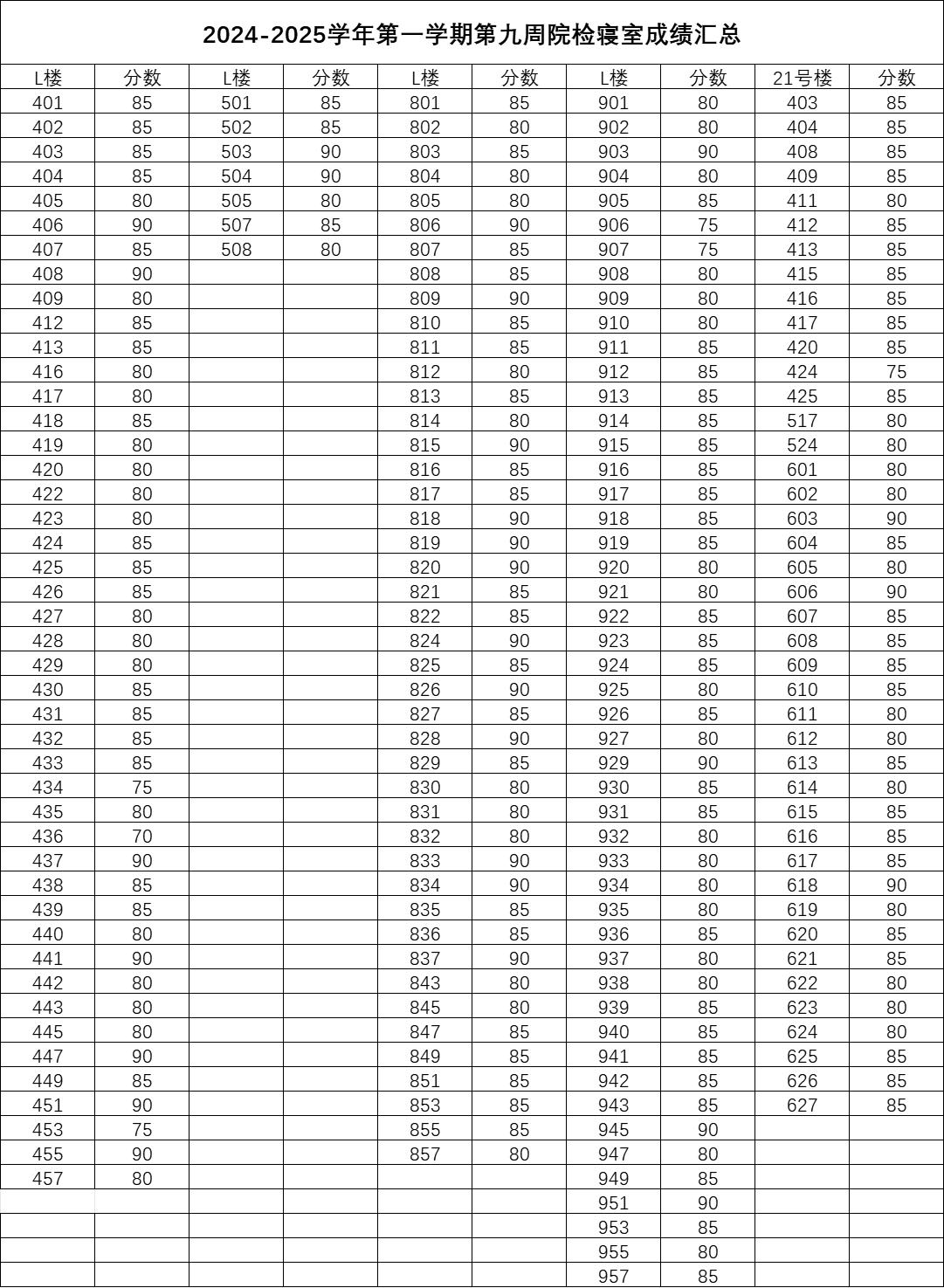 91club 2024-2025学年第一学期第九周院检寝室成绩汇总
