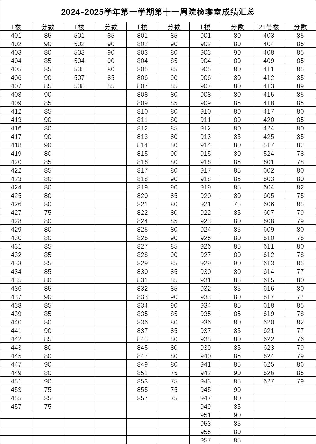 91club 2024-2025学年第一学期第十一周院检寝室成绩公示