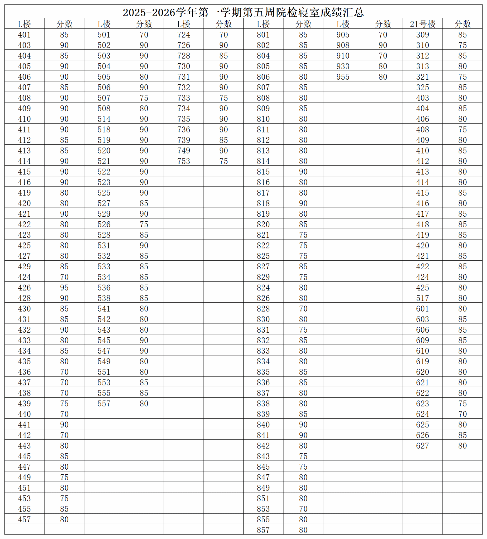 91club 2025-2026学年第一学期第四、五周院检寝室成绩公示