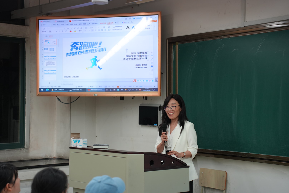 朱老师讲到第一点是自信心,他向同学们强调,“无论要做什么,首先要自信。”朱老师为同学们分析了作为浙传双播专业的优势所在。对比汉语播音,前景更为广阔和灵活,对比其他学校的国际关系专业,优势在于实践能力和播音主持专业赋予同学们的专业能力。第二是上进心,朱老师警诫同学们要不负四年时光,珍惜时间。他鼓励同学们不仅需要专注学习,更要留意实践。要利用好浙传的大平台优势,把学习与运用相统一,理论与实践相结合。最后一点是包容心,包容一切新事物。作为未来的国际性人才,朱老师鼓励同学们要秉持开放包容,兼容并蓄的精神,无论是不同的文化、不同的语言,抑或是不同的观点,都要摒弃固有思想,学会思辨,以平等的姿态,全方位接受新事物。