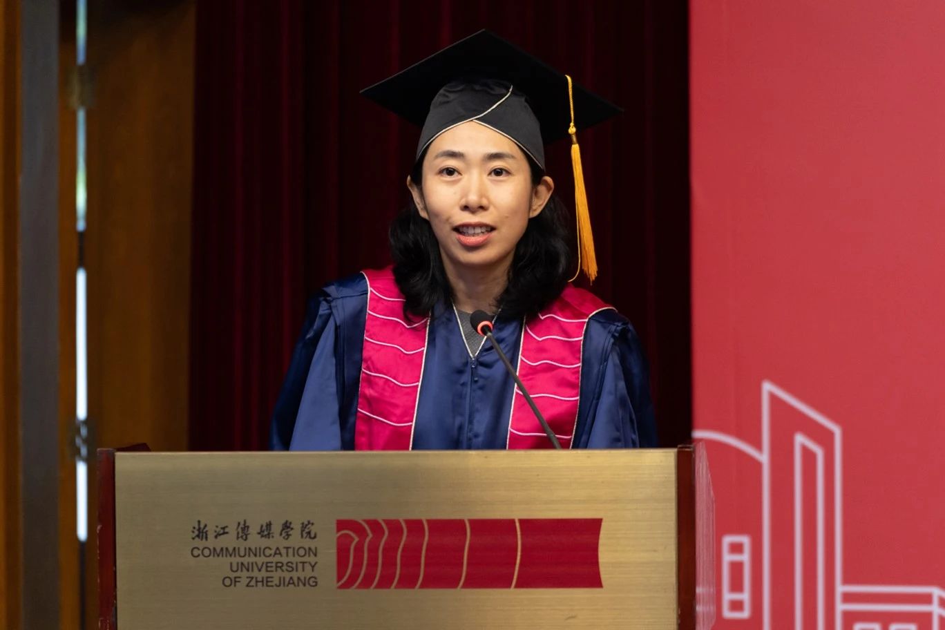 在学位授予环节,学院副院长包晓峰宣读学位授予名单,姚争教授、戴运财教授、邵有学教授、郭建玲教授、黄洁教授、张明芳教授、应宜文教授为学院毕业生们正冠拨苏,行拨穗礼并颁发毕业证书和学位证书。学生们身着整洁的学位服,充满期待地走向台前。