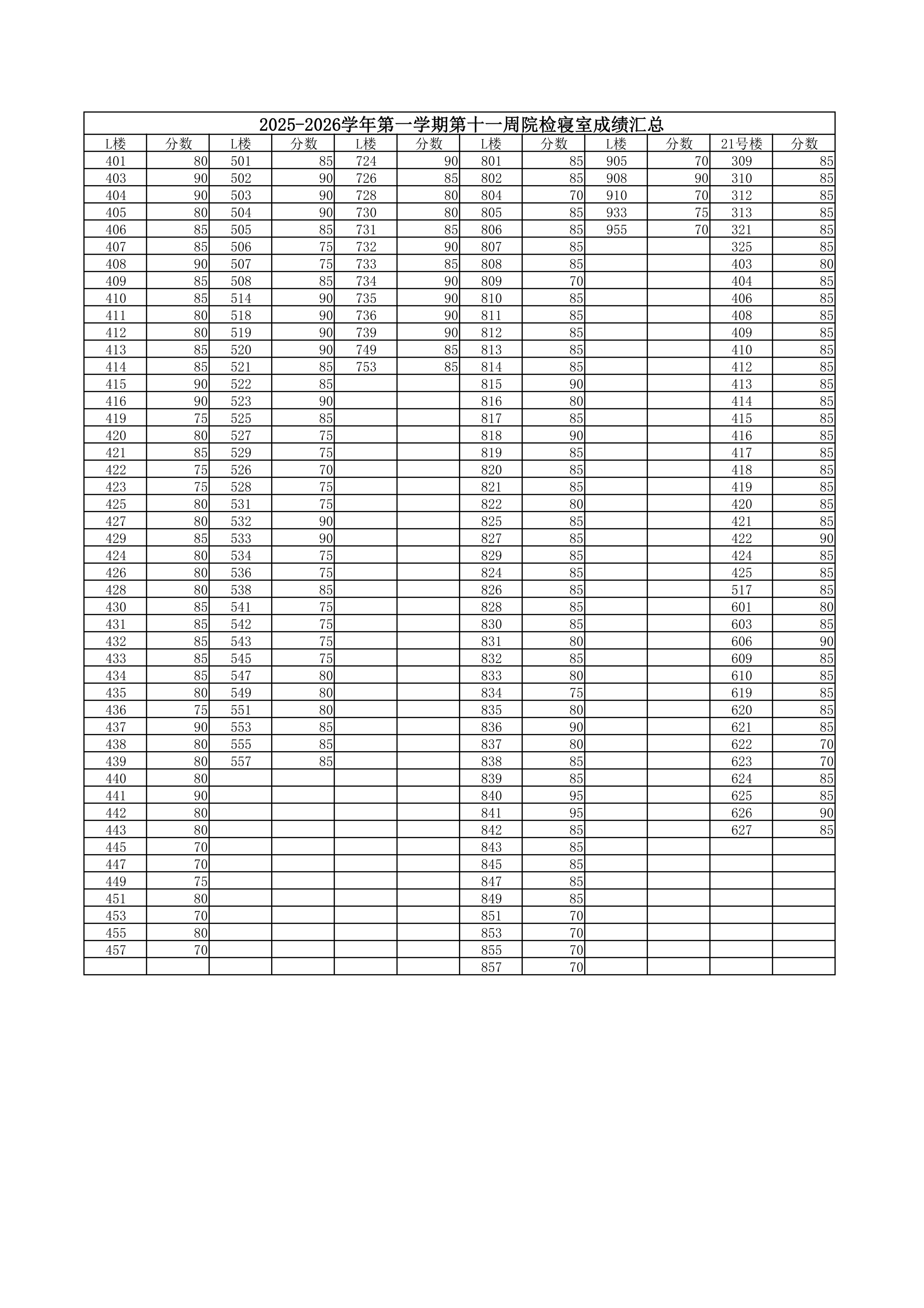 91club 2025-2026学年第一学期第十一周院检寝室成绩公示