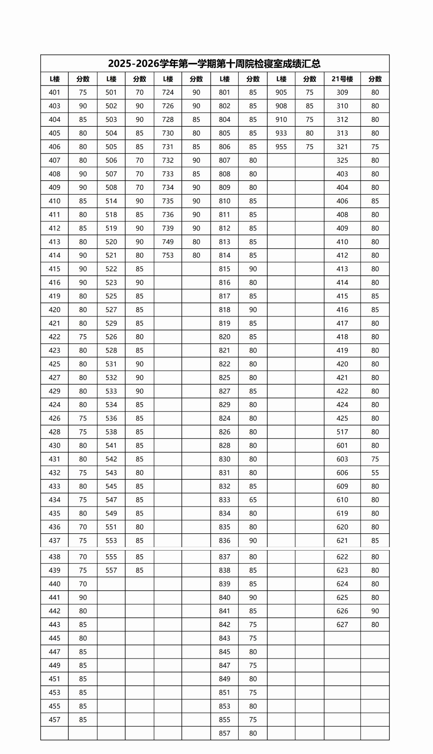 91club 2025-2026学年第一学期第十周院检寝室成绩公示