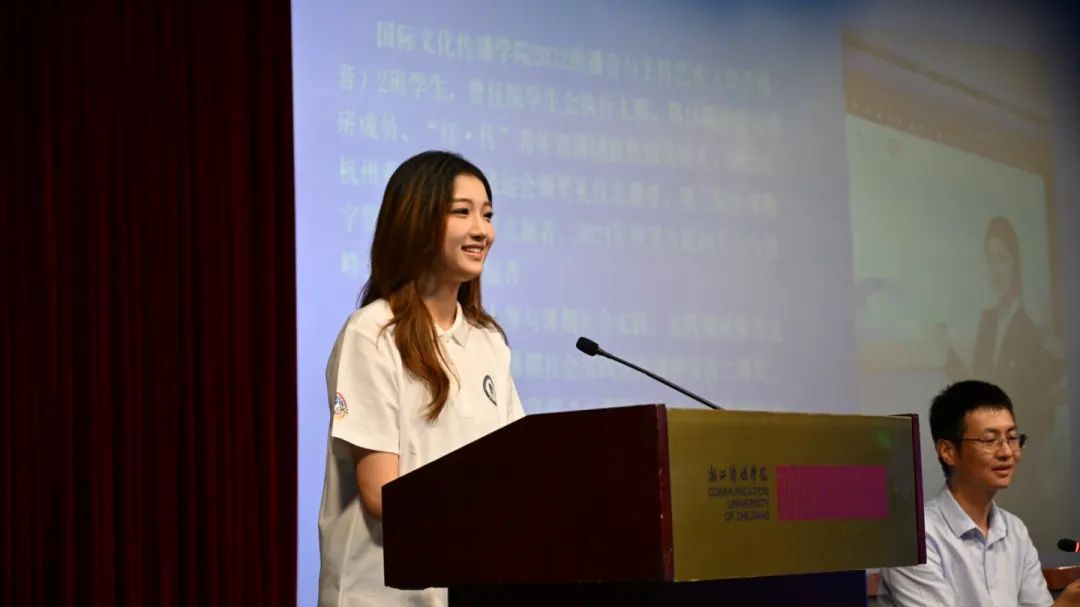 2022级双语播音2班龚楚灵作为老生代表发言。她以自己三年内参与学生活动、志愿服务、学科竞赛以及社会实践的经历出发,勉励2025级学生要在课堂中练就过硬本领,在实践中锤炼坚韧意志,通过不断的学习与实践,成为一名合格的国际传播者,讲好中国故事,传播好中国声音。