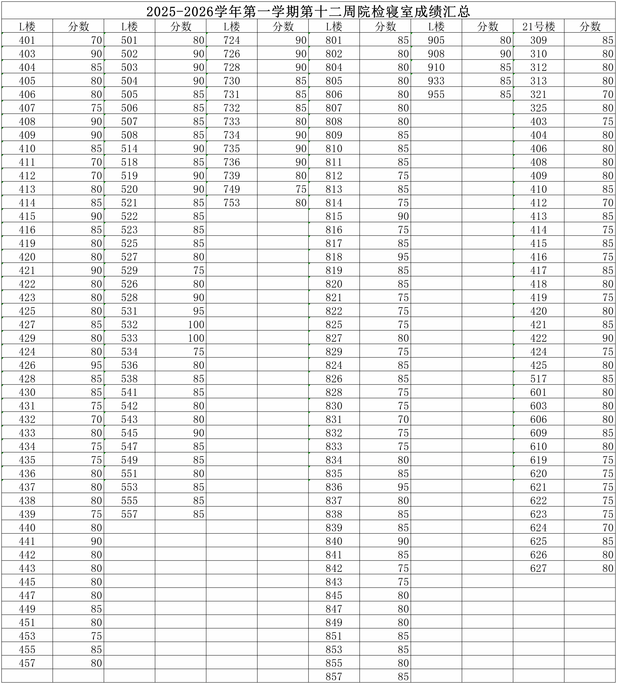 91club 2025-2026学年第一学期第十二周院检寝室成绩公示