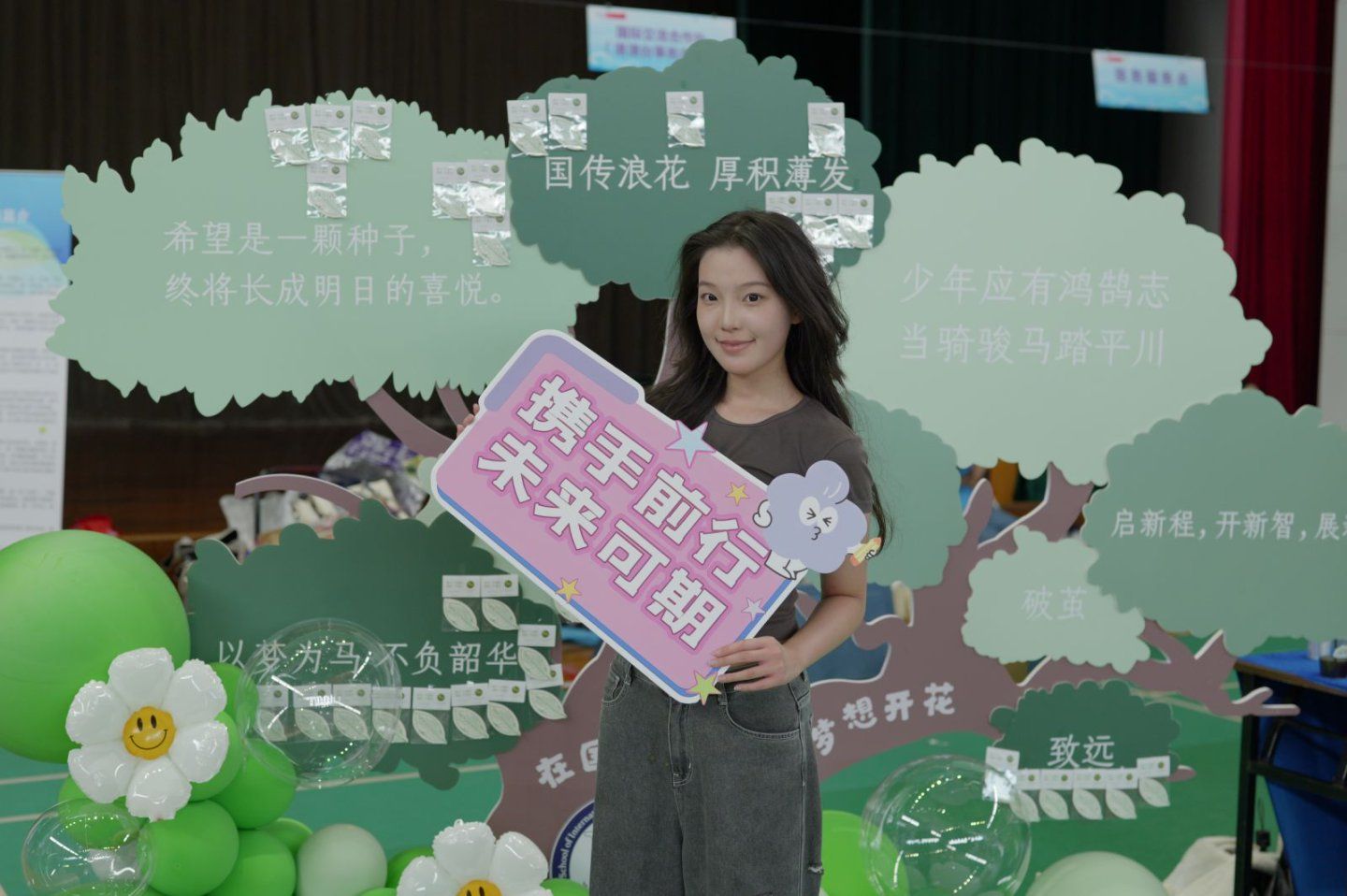 体育馆内的“梦想种子树”装置是今年的重磅惊喜:一棵巨型纸艺大树矗立其中,每片“树叶”都是一张种子纸,“国传浪花 厚积薄发”“少年应有鸿鹄志 当骑骏马踏平川”……字字句句满是期许。更特别的是,这些种子纸里藏着花种,新生们将“树叶”取下,日后种下便能收获“成长之花”。树下环绕着清新的绿白气球花簇,笑脸花朵气球随风轻晃,仿佛在为新生们的梦想喝彩,这里成了校园里最治愈的“打卡地”,每一张合影都定格着“播种梦想”的瞬间。