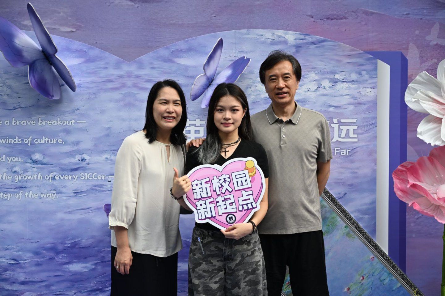 为了让新生快速熟悉校园,我们准备了“寻迹国传”打卡活动——新生手持集章卡片,依次前往体育馆、传媒大道、图书馆、军训场、学院主楼五个点位完成任务。传媒大道上,“国传的故事 由你书写”的艺术喷绘惊艳亮相:莫奈风格的紫色笔触晕染出梦幻的背景,立体的书页装置上,“破茧 乘风 致远”的字样与蝴蝶装饰交相辉映。地面上的“Welcome”花径与艺术画框打卡点营造出文艺画廊的浪漫氛围。