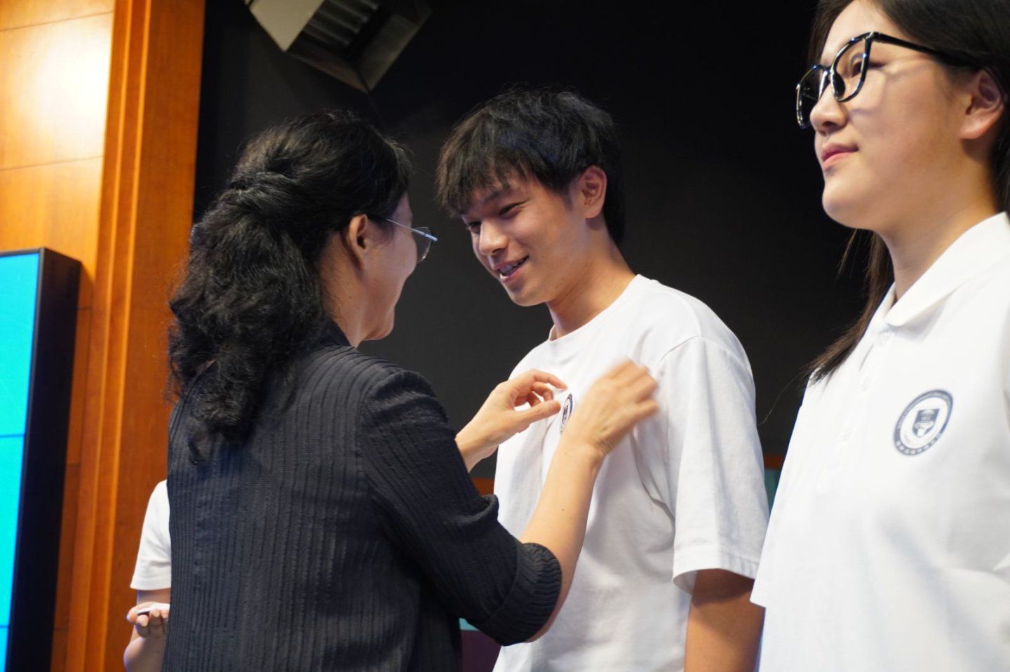党委书记陈斌为2025级新生代表佩戴院徽。当崭新的院徽别在胸前,标志着2025级新生正式成为国传大家庭的一员。