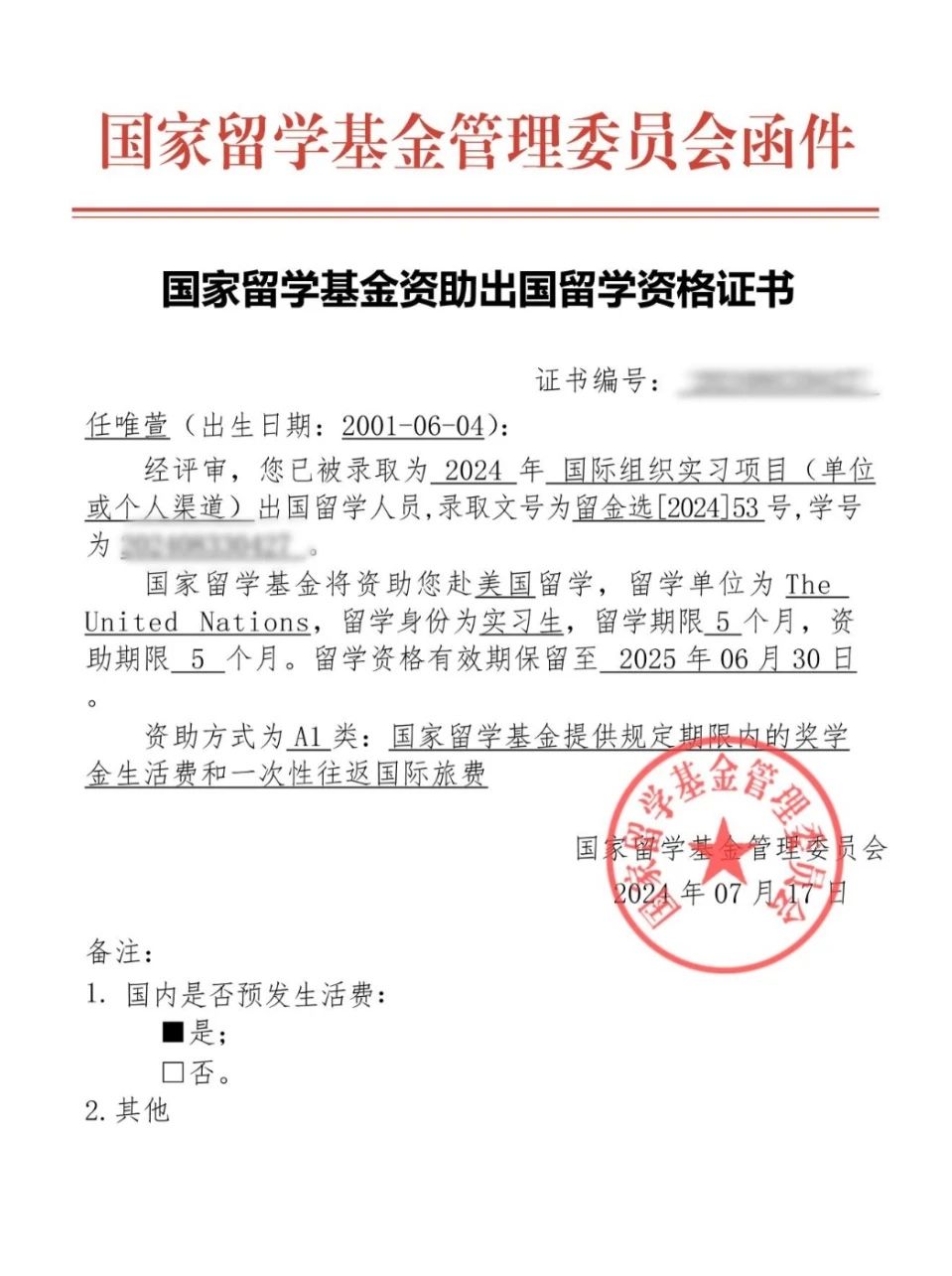 2023年,任唯萱赴雅典交流学习,这次留学为她打开了联合国的大门。在一场讲座上,她认识了来自联合国儿童基金会的老师。由于课堂上积极发言,表现活跃,给老师留下了深刻的印象。在申请实习的过程中,老师为她写了必要材料之一——推荐信。申请的周期持续了将近7个月的时间,这段过程虽然艰辛且难熬,但她从未想过放弃。她笑道“自己的耐商被狠狠考验。”经过5次面试、3次笔试,6月19日,她终于收到了正式offer,并且获得国家留学基金资助资格。